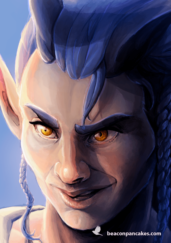 I started the line and worked on it, but soon I had to choose: the line attracted too much attention and belittled the lighting. So I went for the lighting and the color and forgot about the line. I opted to use orange shades for the skin and a complementary blue for everything else to get an intense palette. I worked little by little, using multiple layers and color corrections in the way, playing with translucency and saturation. In the end, I am delighted with the final colors. The character has a good balance of light and shadows, saturation and desaturation, and a good sense of the three dimensions. I like to think that he is also telling something else with his pose and expression. Maybe we could try to guess whatever he is saying!