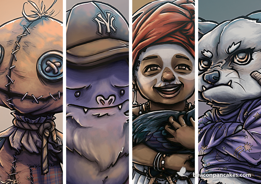 The third one was the voodoo priestess since I didn’t want a «regular» witch. This required me a little bit of documentation… I was thinking of a voodoo doctor with many skulls, bones, a cigar, and a suit with a vest. But in my search, I found that the real priestesses are more interesting than the ones pictured in popular culture. So I tried to draw her interesting enough! Once again, I repeated the process and picked some beautiful earthy tones with reds and whites. I called her Marie in honor of Marie Laveau.