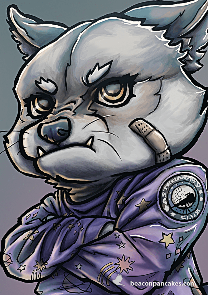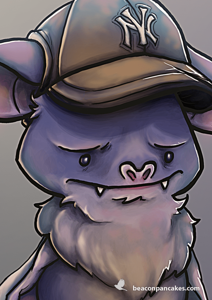 The second one was the bat, and here I also wanted to make a joke with the double sense of the word «bat.» He looks so sad; it seems like he has lost his game! Or maybe he still doesn’t know how to use that bat correctly? I used the same process with the same type of layers and colors. The base colors were purple, pink, and yellow for contrast this time. The greens were a late addition, but they worked very well. I called him Baltimore Jr. because my husband and I had already called Baltimore a bat drawing once.