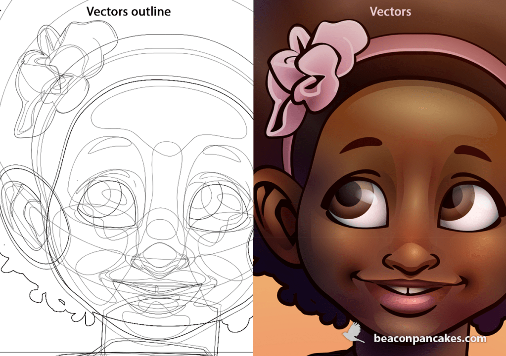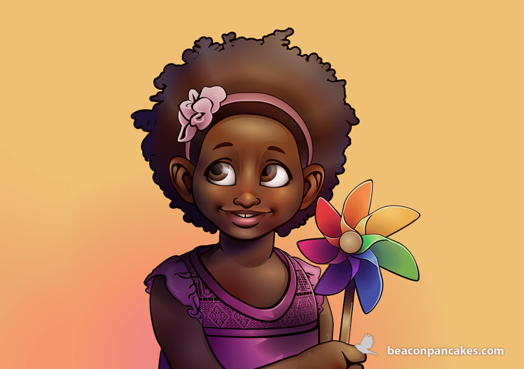 This time, I was looking to paint more girls, like the ones reading I had been working on a month ago. I also wanted to work more on curly hair because I find it quite laborious and wanted to try to simplify it. Also, I wanted to make something happy and bright, with lots of pinks or yellows. Then, I visualized a little girl with a cunning smile and a lovely pink tee and started to work straight into Affinity.