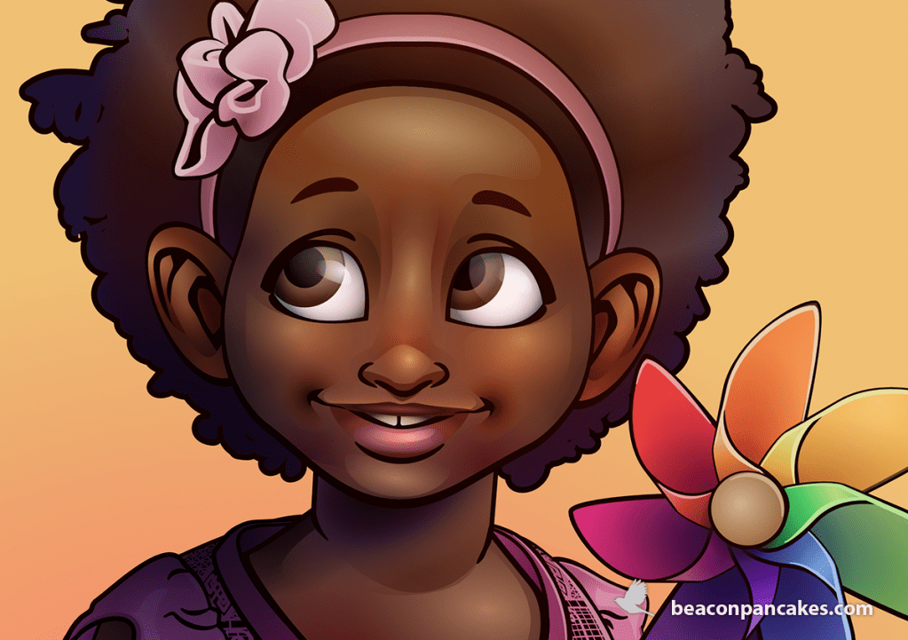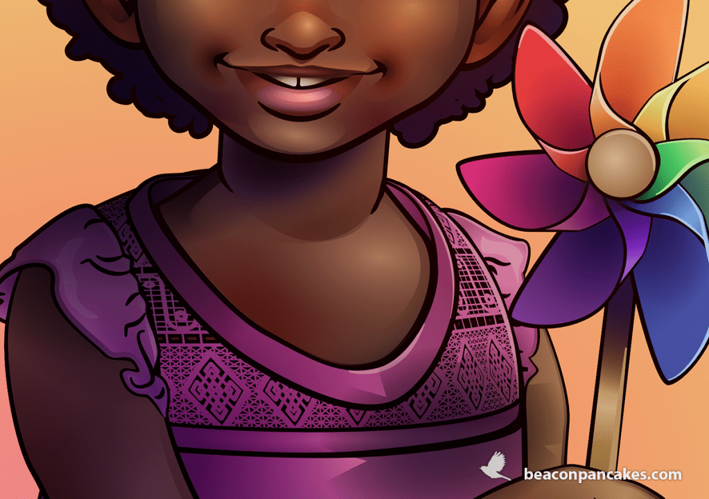 I enjoyed the process a lot. I am pleased with the overall colors, the skin tones, and the balance of the multicolored windmill toy. I also enjoyed making the embroidery of the t-shirt. At first, I thought it was too much information, but I loved the texture when I put everything together. I am also happy with the simplicity of the hair’s silhouette, in contrast with the complexity of the color layers.
