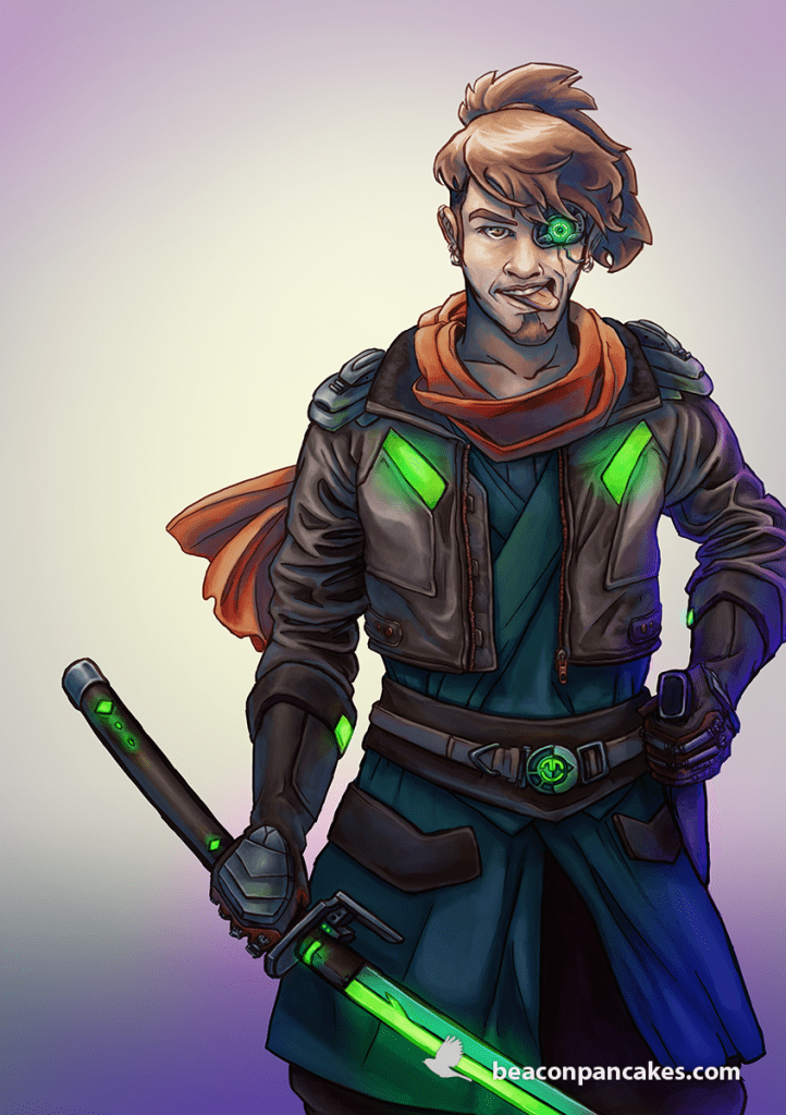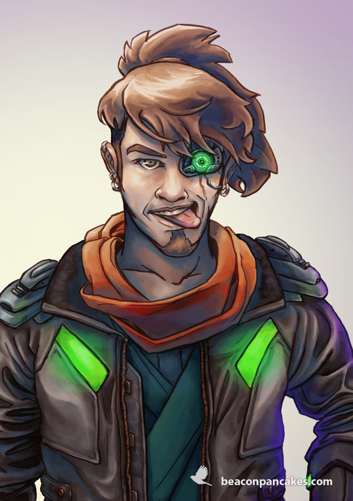 He is a character from an old story that my husband and I submitted to a comic contest. He was a space pirate looking for a treasure while he fled from the Crown and his ex-lover, who wanted to kill him. We did not win anything, but we had a great time! More than ten years have passed, and the character and the story still attract me.