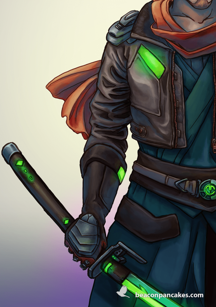 This time I wanted to update his design and make him more futuristic. I looked for some cyberpunk references, and I found them fit perfectly in what I had imagined. I wanted just a few futuristic traits since I preferred to make it simpler. I also decided to use a line-based drawing and have an unpolished colorwork to look more dynamic and work faster. The colors also have a lot of presence because I wanted to use the acid colors of the cyberpunk and contrast them with dark strokes of browns, grays, and violets.