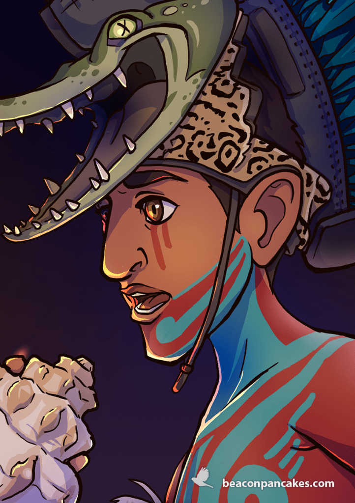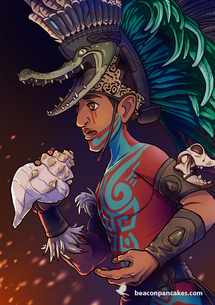 Some friends traveled to the Yucatán Peninsula in Mexico this past summer on vacations. It sure was a fantastic trip, and my husband and I felt very jealous every time they sent us incredible pictures of landscapes, beaches, monuments, and food. One of the pictures caught my eye immediately: it was from a dinner theater, and it showed a man dressed as an ancient Maya. He had a beautiful and elaborate headdress with the head of a crocodile and very long feathers (I assume there were from a quetzal). His skin was painted, adorned with symbols, and he had a big seashell horn. He was amazing! When I told this to my friends, they sent me a lot more pictures of him, almost from every angle! So for me, it was clear: I had to draw this man!