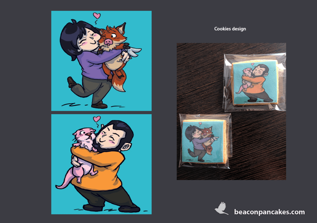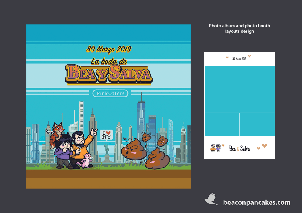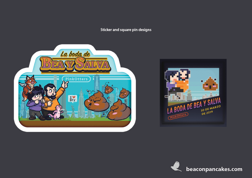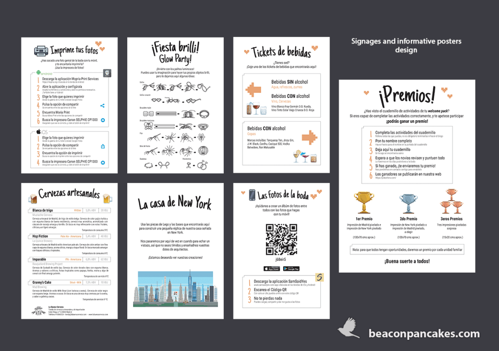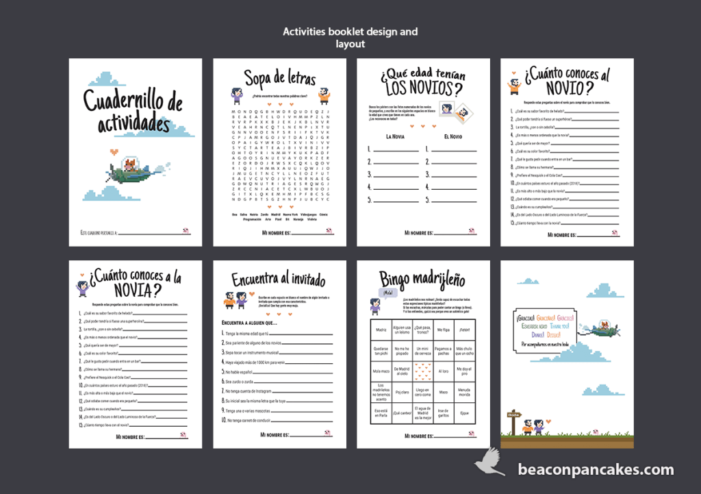 Of course, we also had to have welcome packs for the guests! They included a booklet with activities and games about the bride and groom (absolutely one of the best ideas!), a personalized sticker, and a personalized pin. Also, to add something sweet, cookies with illustrations printed on edible paper!