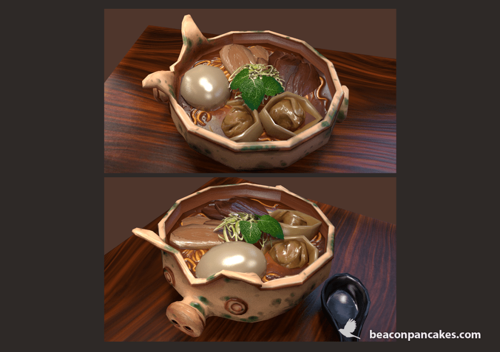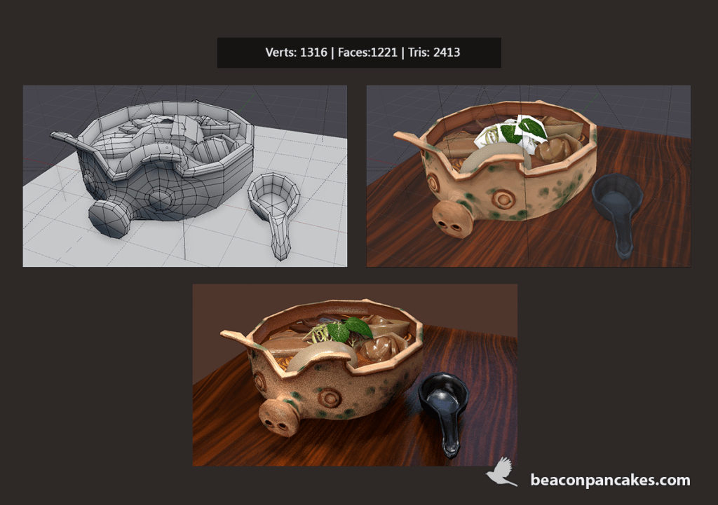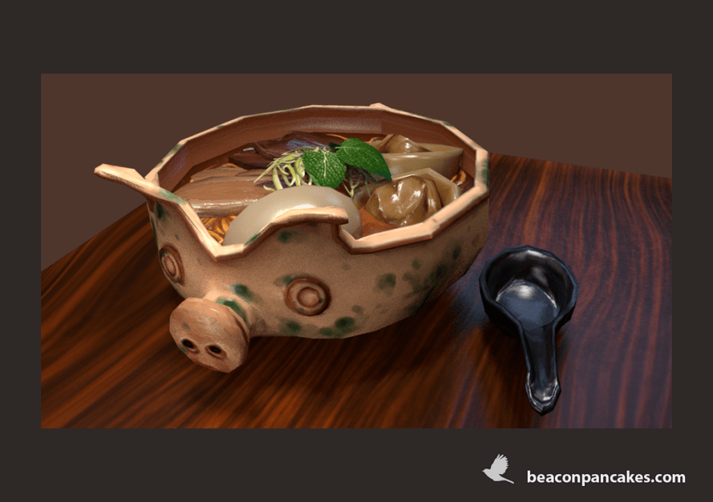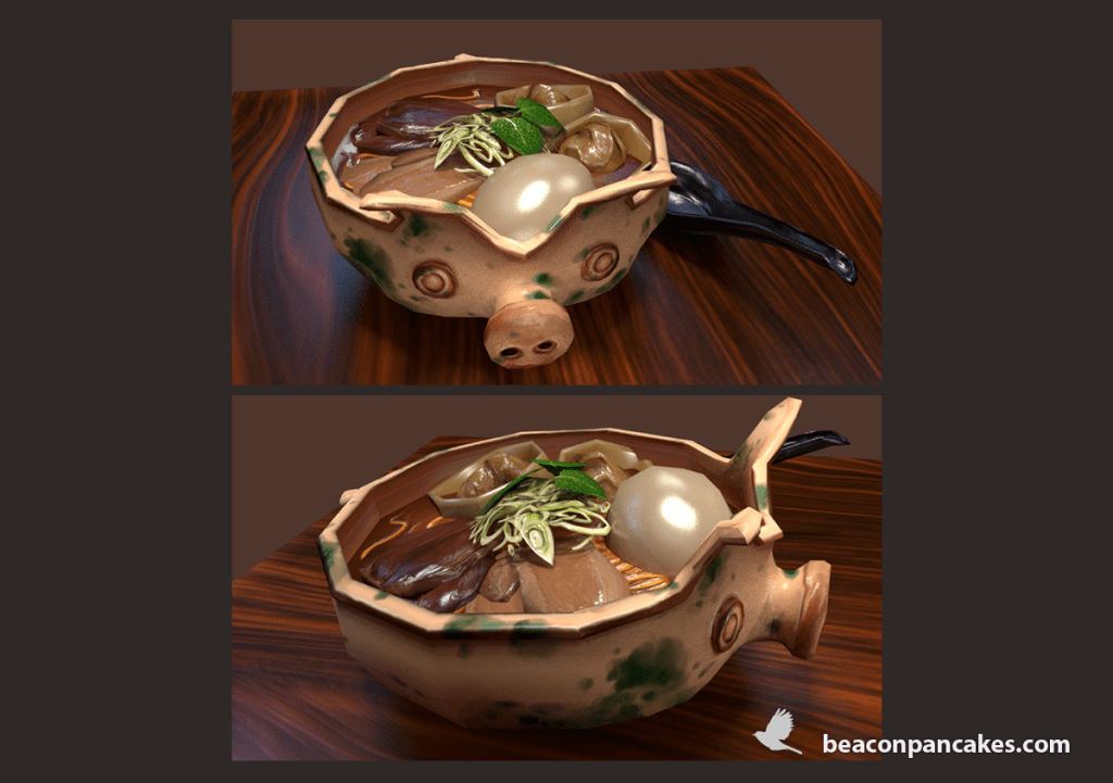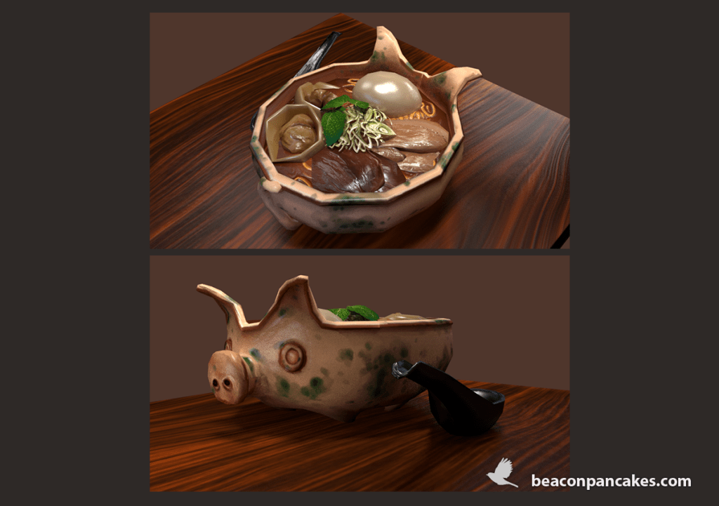 I finished my Croissant Taiyaki (previously in the portfolio), and I soon started to look for another cute food to model in Blender. And soon enough, I remembered that I had been to a good restaurant that fusion Asiatic and Spanish food. The most memorable dish was a ramen dish made of cocido madrileño (a Spanish stew) served in an incredibly adorable pig bowl! I already had my model!