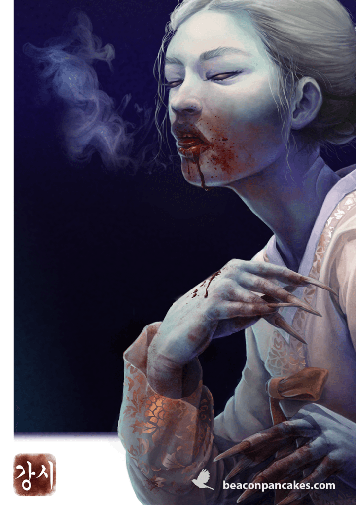 I have seen recently a TV show set in the XVII century in Korea. It is very refined and detail-oriented, mainly with the clothes, the tools, and the architecture were all surprisingly beautiful. I did not know anything about this period, and the show aroused my curiosity. This is why I have been looking at a lot of Korean traditional art. I wanted to draw something related to all this, and I preferred to draw something grimmer since my last works have been bright and friendly. So I started to look for monsters in Korean mythology, and I found the gangsi, better known as jiangshi or Chinese hopping vampire.
