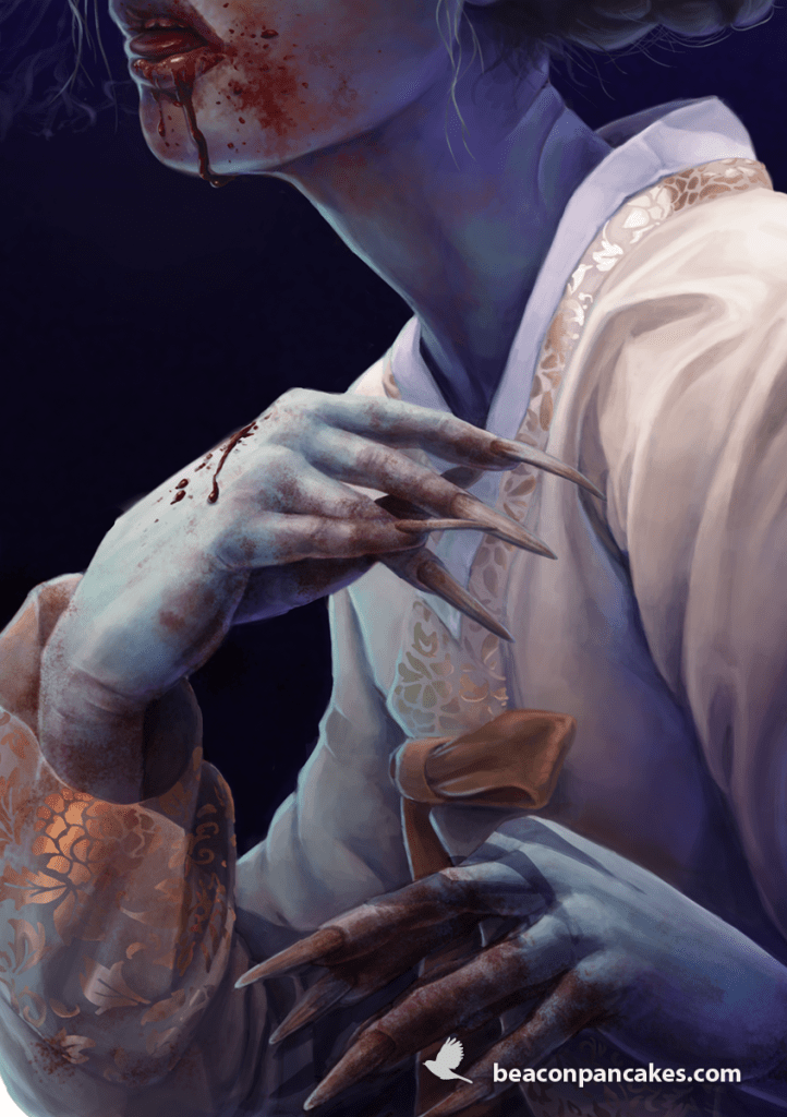 I used references images of hanboks (the traditional dresses) and hairstyles for the drawing. I tried to maintain simplicity in the clothes and hair complements and use colors that enhance the greenish-white skin. I chose a bright zenithal light, which provided a delicate blending of shades and an ample range of tones. The blood was great to add contrast and, at the same time, to add more texture and to play with different brushes. The general strokes were also slightly unpolished to have a little bit more grittiness and to create interest. As final touches, I did a seal with the word gangsi in Korean, and I put some gradients in the background as in the Asian woodblock prints (I am a big fan of these).