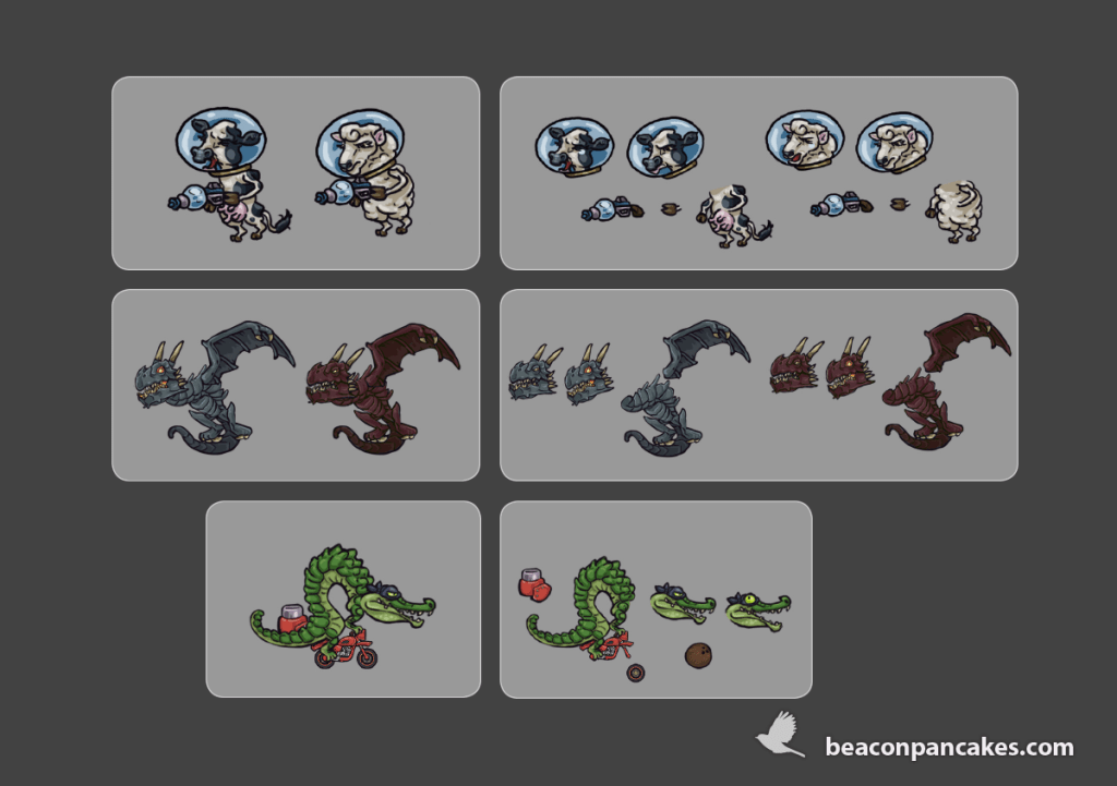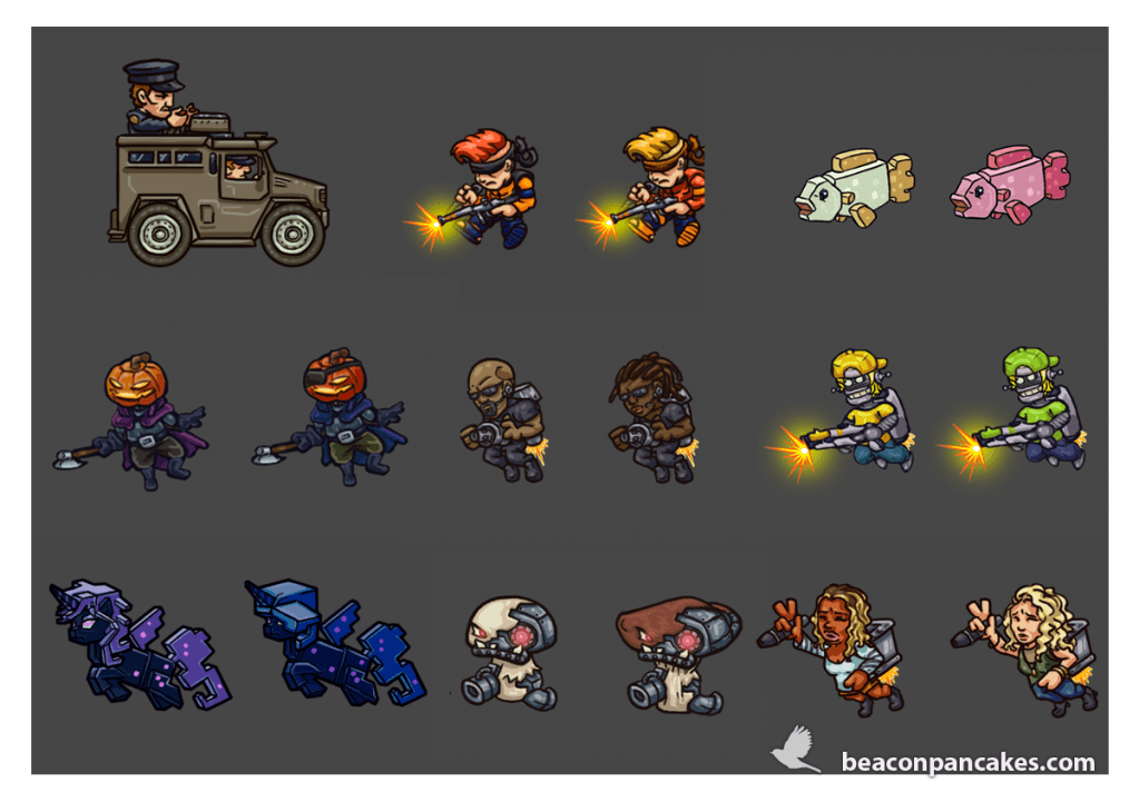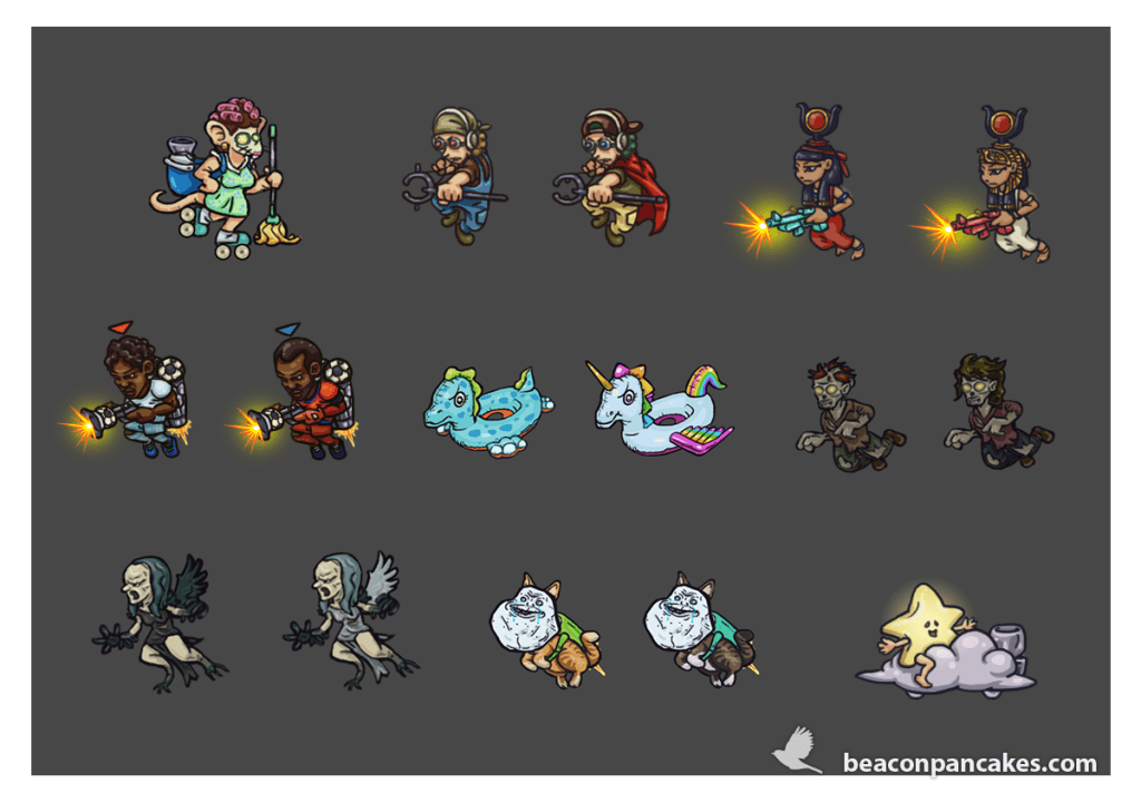 These are some of the enemies I made for the mobile video game YouTurbo, developed by HeYou Games. They were created in Adobe Photoshop and exported into several pieces to Unity, where we mounted and animated them for the game. We had a tight deadline, so we needed to work fast, agile and coordinated. It was a great challenge.