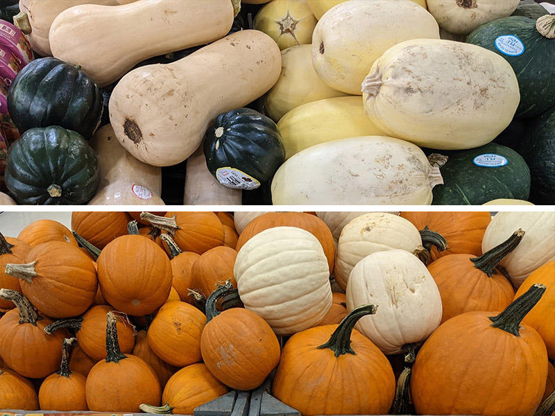 Empezando por arriba, acorn squash (verde oscuro y pequeñas), butternut squash (anaranjadas y alargadas, con la base redonda), spaghetti squash (amarillas y cilíndricas) y kabocha squash (verdes y redondas, apenas se ven). La foto de abajo son pumpkins naranjas y blancas.